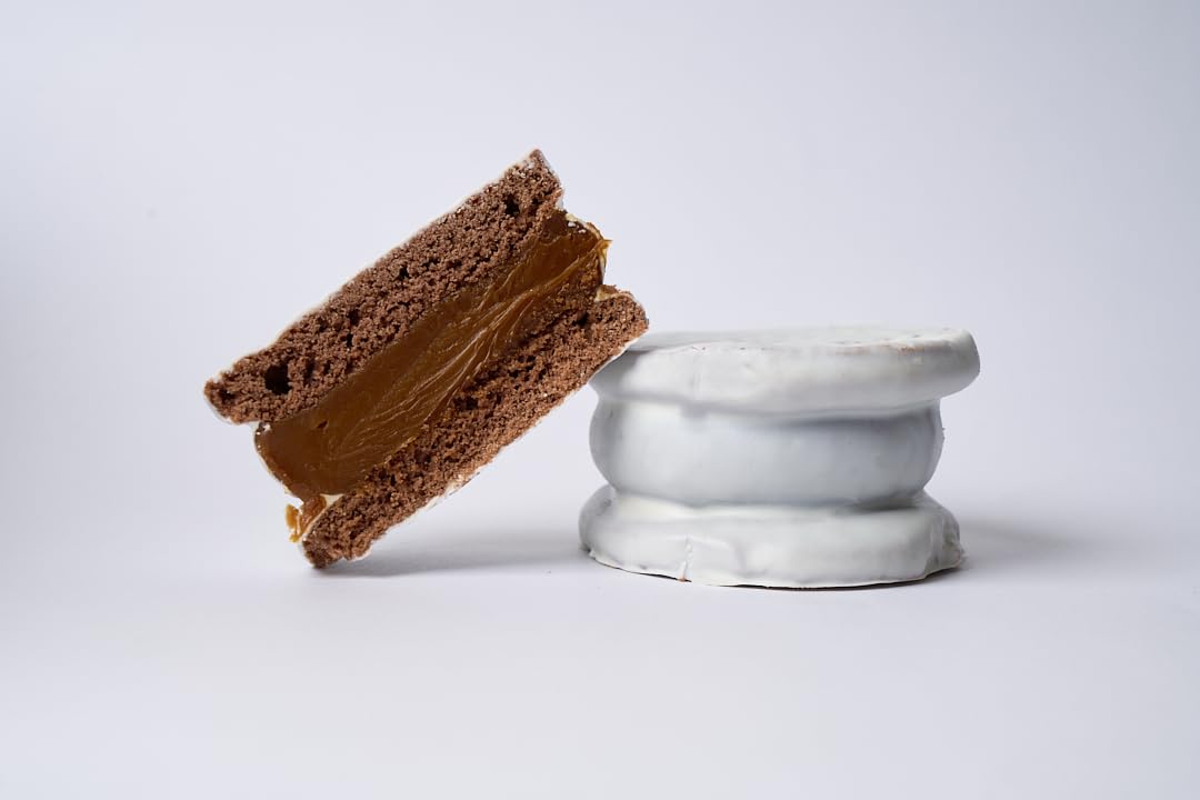 Soft biscuit, generous filling with dulce de leche and a thin white chocolate topping.