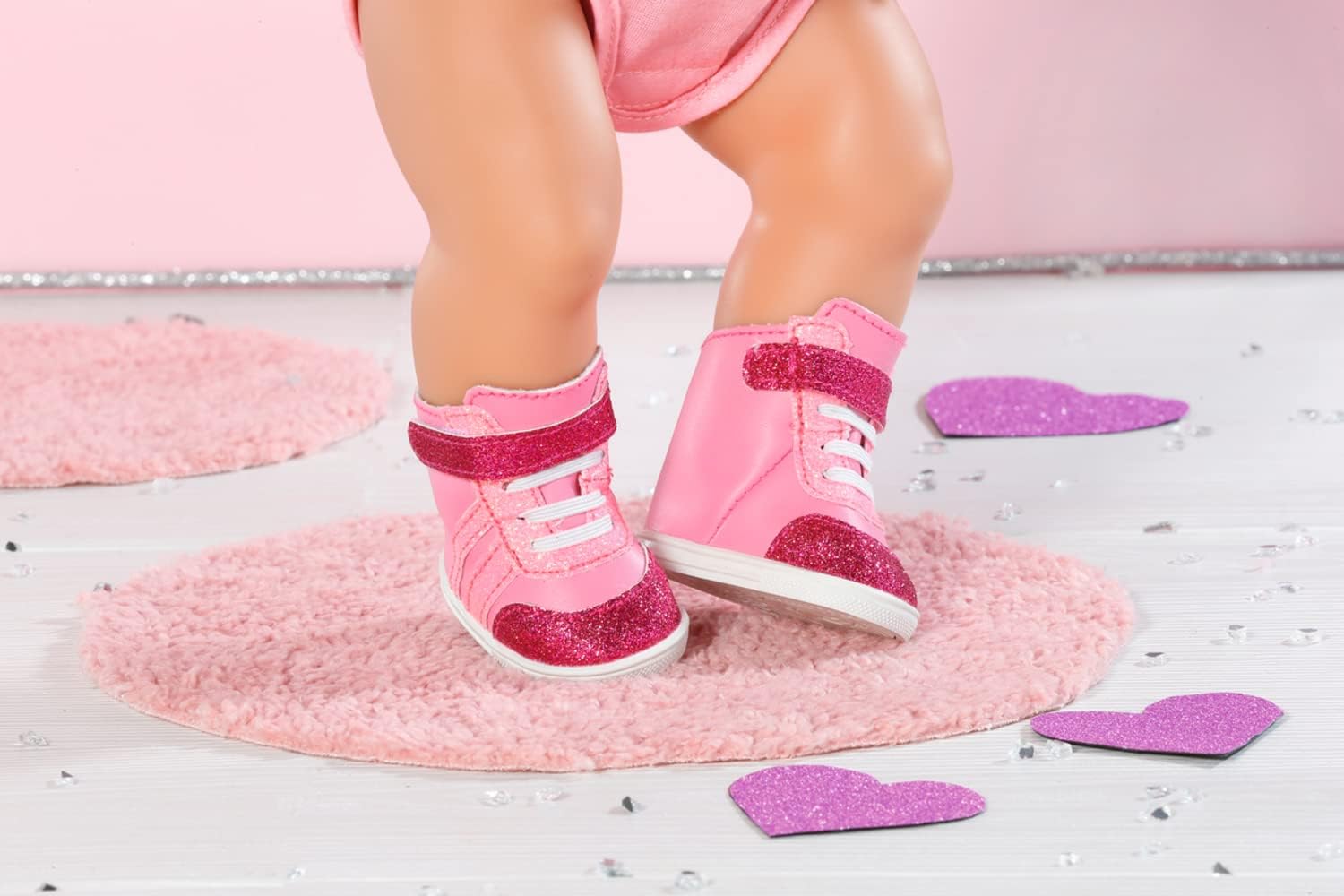 The ankle-high trainers are coloured in cute shades of pink. Recently, BABY born has been sneaking around her bedroom like a little pink panther. The quiet soles and the white laces are in perfect harmony with the trainers, which are coloured in different shades of pink. The hues of the shoe material, the stripes, the Velcro strip and the tips only differ slightly. Of course, there simply has to be a bit of glitter on the pink. The shoes are ankle-high and hold the little explorer steady when she’s out and about. High-quality clothing for the BABY born branded doll. For enhanced, diverse and long-lasting fun through play. BABY born Sneakers pink 43cm.