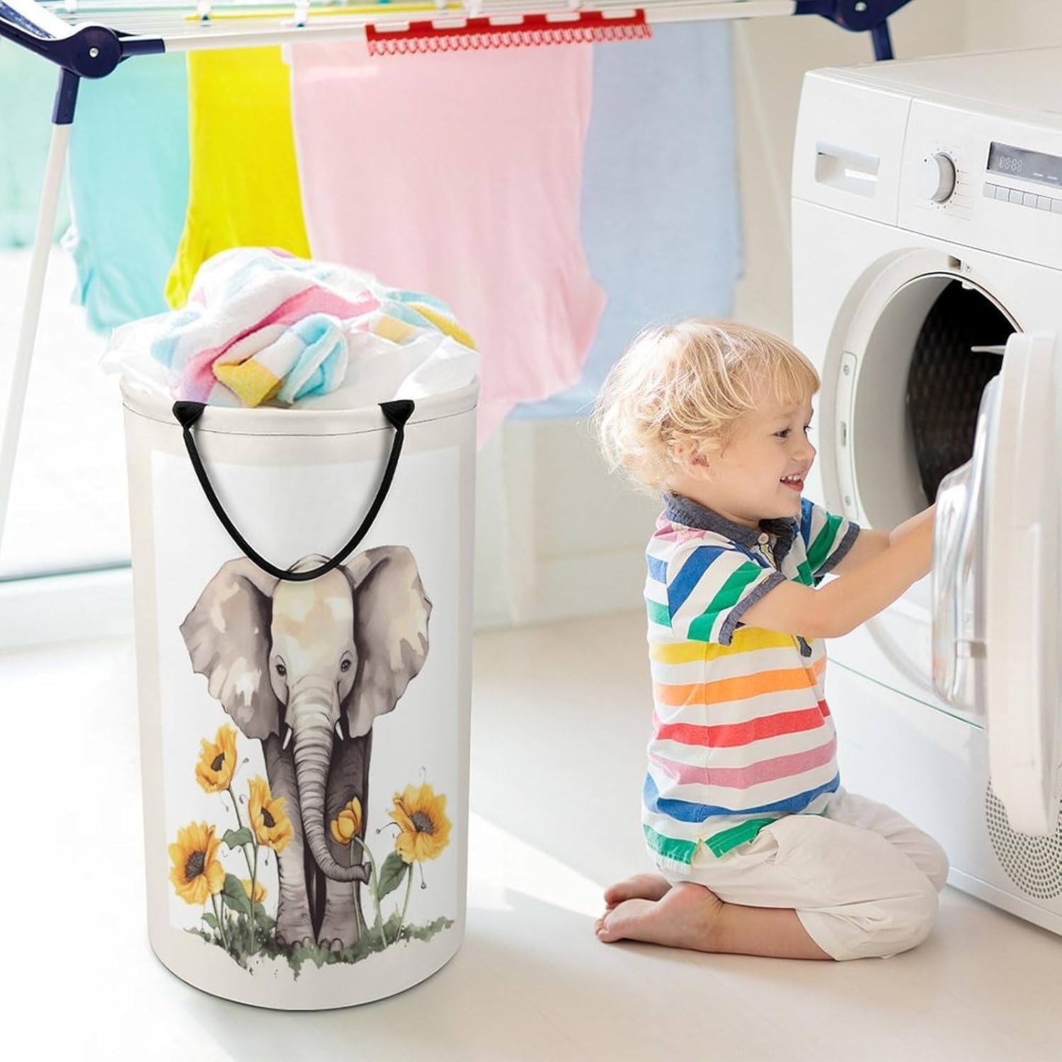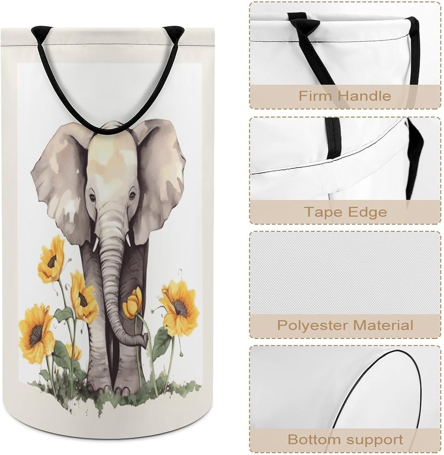 The pattern of the Elephant And Sunflower hamper is printed with exquisite patterns, which makes the product more attractive.Chic design allows it to be used in the living room to hold throw blanket, pillows, and reading materials, as well as in the bathroom for towels, or as a laundry hamper.The laundry hamper adopted collapsible design, equipped with handles. It is lightweight and portable for using, storing, and moving conveniently.Elephant And Sunflower Clothes hamper is suitable to store dirty clothes washing, place in the room to store toys, and other household goods, keep the house clean and tidy. Perfect laundry hamper for home, office, closet organizer, bedroom, bathroom, college dorm, etc.Gets out of your way when you need it to. This storage basket or laundry hamper is a good gift, which not only meets everyday storage needs but also carries deep care and love, a perfect way to turn thoughtfulness into warmth.
