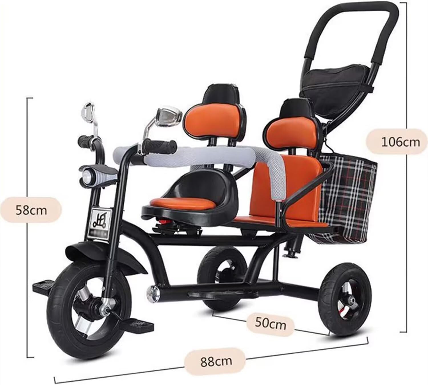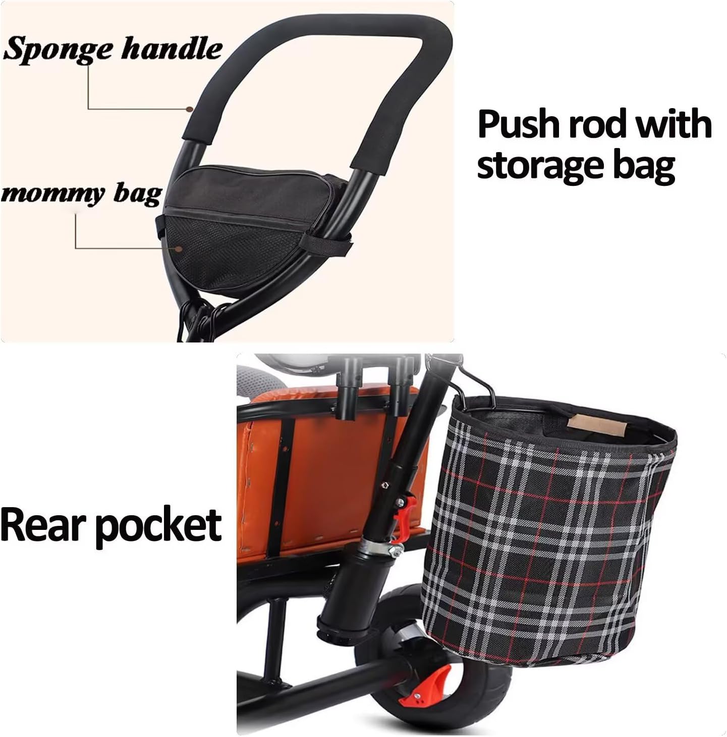 Features: 1. Double seat, front seat with guardrail, rear seat with armrest. 2. Removable parent handle, transform the stroller into tricycle. 3. Rear wheels with double brakes. 4. Shock absorbing rubber titanium wheel, no need to inflate, long service life. Basic information: Frame: high carbon steel Handle: rubber Wheel: titanium wheel Max. load: 110 kg Suitable age: 2-5 years old Suitable body height: 85-120 cm Size: car total length 88cm, rear wheelbase 50cm, handlebar from the ground 58cm, push rod from the ground 106cm, suitable user height 85-120cm; Package: 1 x pram tricycle (you need to install it yourself). Note: 1. Do not use on public roads and ensure children are accompanied by adults when using. 2. The age and body length of children applicable to the stroller trike is the basis. When ordering, pay attention to the physical development of the child. 3. If you have any questions about the installation process, please feel free to contact us.