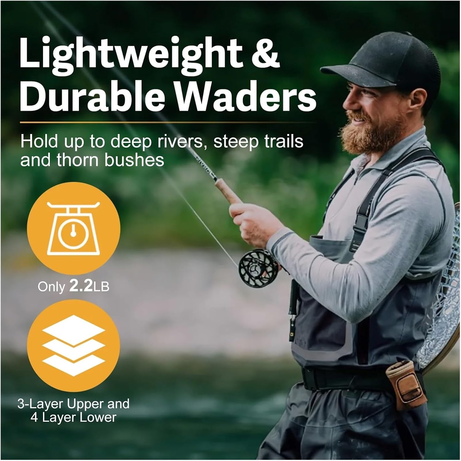 Features:1. Widened shoulder straps and reinforced buckles.2. Waterproof zipper for storing small items.3. One-piece sock cover, made of neoprene material, waterproof and wear-resistant.4. Fix the hook to prevent the trouser leg from moving up.Notice:1. Please check the product size chart carefully before purchasing, so as to get the best size and avoid wasting time.2. For ease of movement, make sure the inseam of the wading suit is 3-5 inches larger than the inseam of the pants.