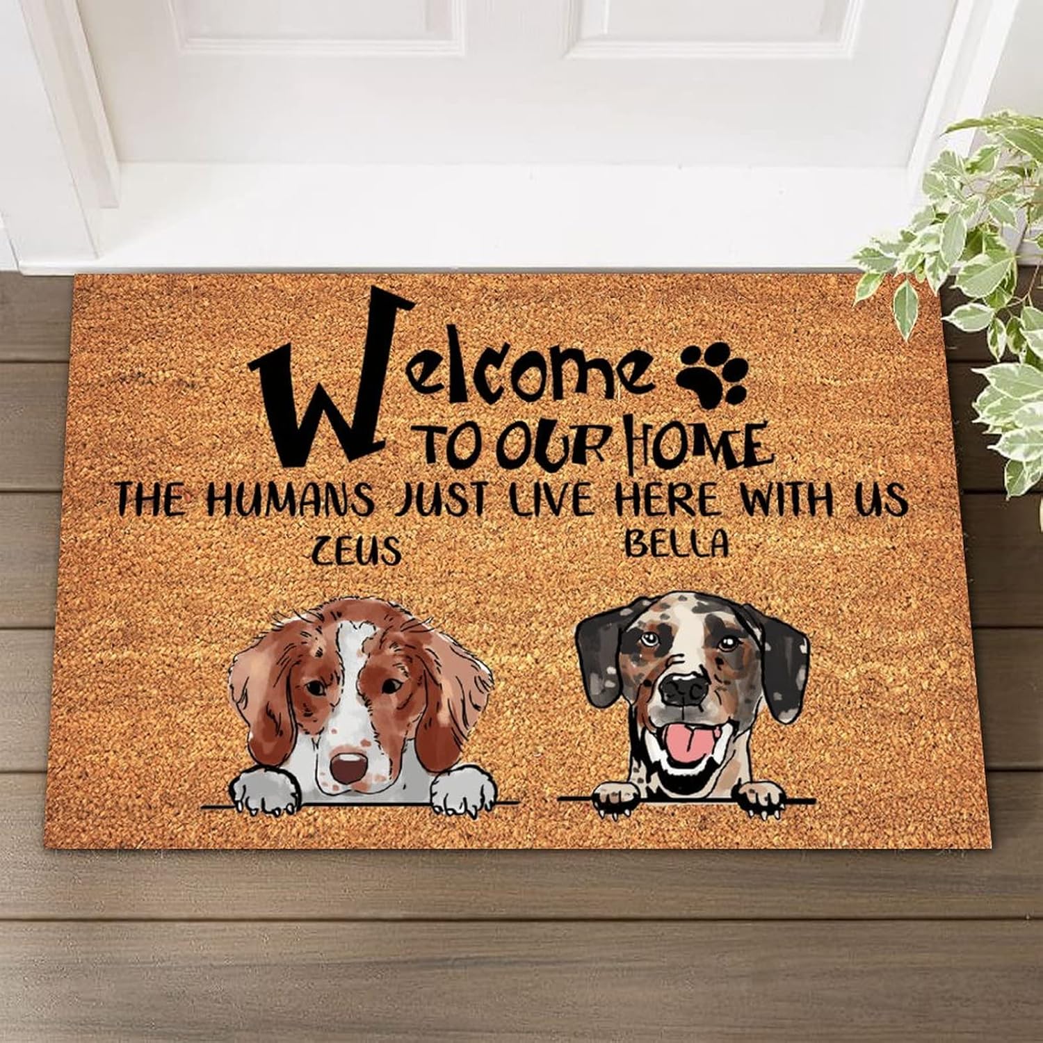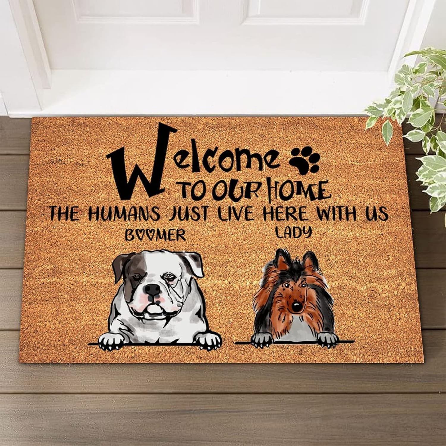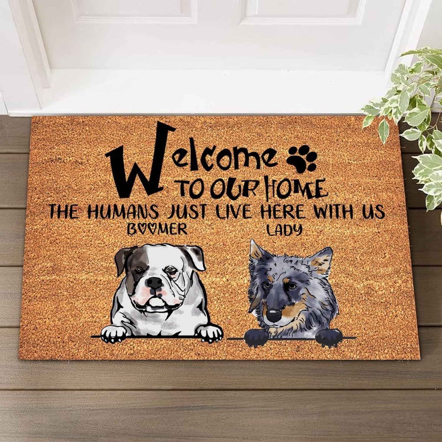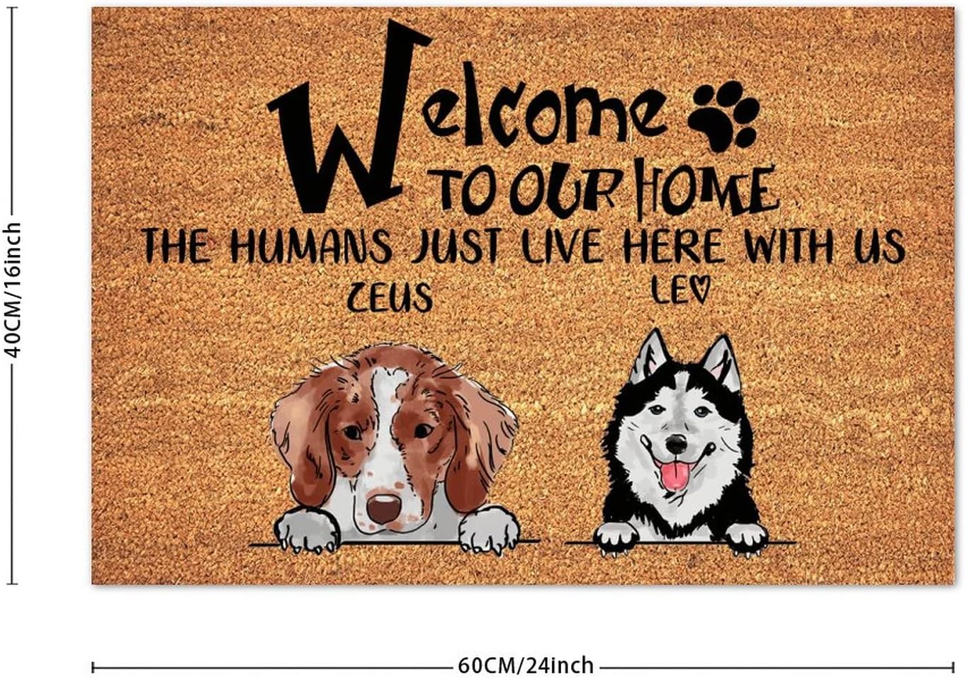 FeaturesWelcome to Our Home,The Humans Just Live Here with Us Coir Door Mat Custom Pet's Name Houses Doormat Front Porch Easy to Clean Dog Cat Pet Lovers Gift Entryway Outdoor Floor Door Mat 16x24in Functions and advantages of the door mat1, Beautiful Exquisite Embroidery Craftsmanship DoormatThe outdoor mat is a great gift for your home decoration.It will leave a lasting first impression and will help to welcome your guests and visitors in style.Your visitors will love the warm greeting they receive when they come for a visit.These functional and attractive mats have eye-catching designs that are a charming and welcoming addition to your home funny decor.2, keep your house cleanWaterproof Doormat comes with strong weaving pattern. Waterproof Polypropylene floor mat. pet friendly.This rug is ideal for scraping dirt and mud of the shoes .4, High quality Floor MatThe outdoor entryway mats are made of all-natural and sustainable vinyl fiber and backed with non-slip rubber backing for durability and safety.The wide variety of unique designs are hand finished using permanent dyes for long-lasting style.Our heavy-duty doormats are ideal for high-traffic areas, including front entryways.Warm tips(1), There may be slight differences in color due to lighting, camera, etc. during shooting. the color is subject to the actual object.(2), Manual measurement will have an error of 0.1-0.3 inch